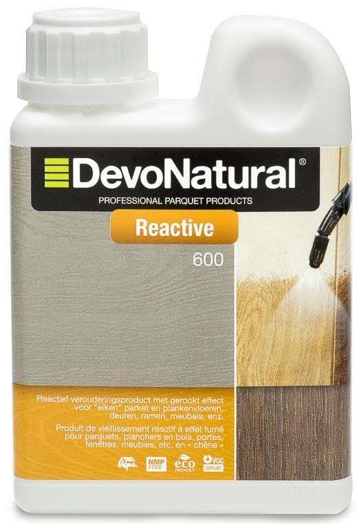 Apply only to oak! DevoNatural Reactive is a reactive aging product available in 2 concentrations: 400 and 600. The higher the concentration, the more powerful the reactive aging will be. When used on oak, DevoNatural Reactive makes the wood age naturally. The effect can vary, depending on where the wood was grown, as well as the type and diversity of the oak. The tannic acid levels in the oak determine the chromatic effect!