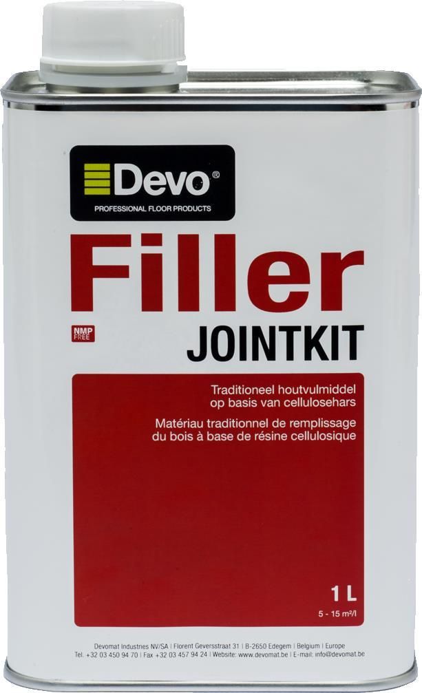 Préparation du produit : Mélanger Devo Jointkit avec une fine poudre de bois obtenue par ponçage avec un fin papier abrasif. La pâte obtenue doit être résistante et ouvrable. La proportion de mélange est d’environ 1 part de poudre de bois pour 3 parts de Devo Jointkit, mais elle dépend toujours du type de bois, de la granulométrie et de la consistance souhaitée de la pâte. Pour le remplissage de joints, de fissures et de dégradations minces dans des planchers en bois, il est recommandé de rendre la pâte un peu plus liquide pour faciliter la pénétration. Dans le cas de fissures et de trous plus grands, la pâte devra être plus résistante.