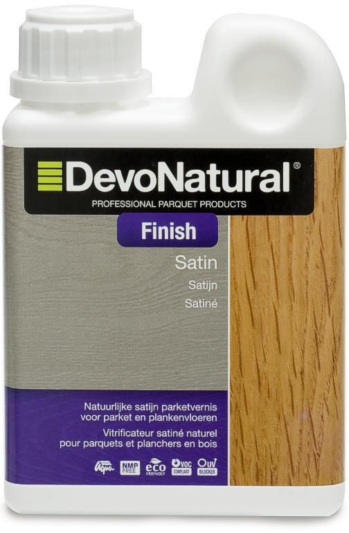 Deze watergedragen, weinig verkleurende, elastische en verzegelende binnenafwerking geeft een “natuurlijke zachte zijdeglans” aan alle houten vloeren en diverse types parket die niet gekleurd zijn. Wordt ook gebruikt op nagenoeg alle houtsoorten. DevoNatural Finish satijn is binnen ook toepasbaar op houten deuren, meubelen, plafonds, enz.