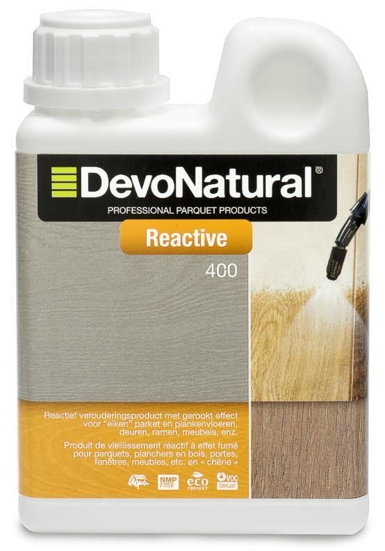Enkel toe te passen op eikenhout! DevoNatural Reactive is een reactief verouderingsproduct verkrijgbaar in 2 concentraties: 400 en 600. Hoe hoger het cijfer, hoe sterker de reactieve veroudering. Op eikenhout geeft DevoNatural Reactive een natuurlijke vergrijzing van het hout. Het effect kan verschillend zijn afhankelijk van het groeigebied, de soort eik en de diversiteit van het eikenhout. Het looizuurgehalte van de eik bepaalt het kleureffect!